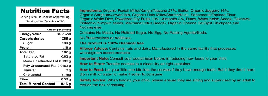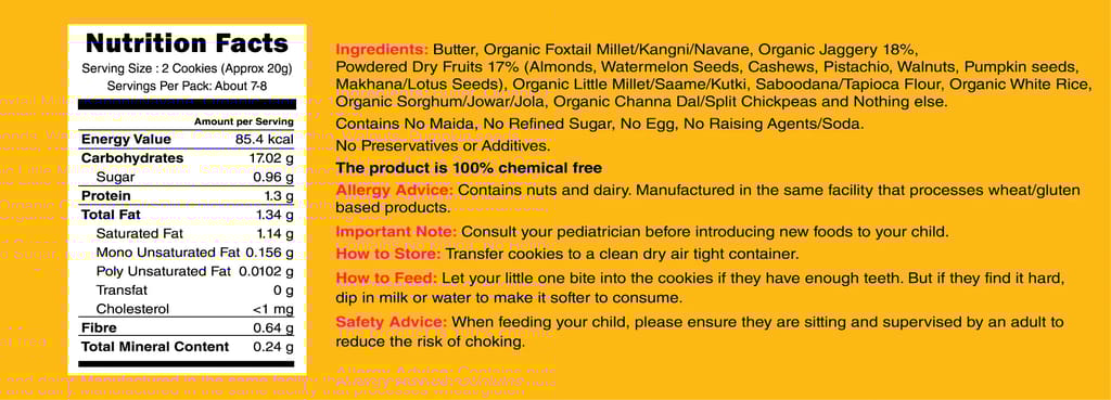 - Ingredients Include, Organic Foxtail Millet/Kangni/Navane, Butter, Organic Jaggery, Organic Sorghum/Jowar/Jola, Organic Little Millet/Saame/Kutki, Saboodana/Tapioca Flour, Organic White Rice, Powdered Dry Fruits, (Almonds, Dates, Watermelon Seeds, Cashews, Pistachio,Pumpkin seeds, Makhana/Lotus Seeds), Organic Channa Dal/Split Chickpeas