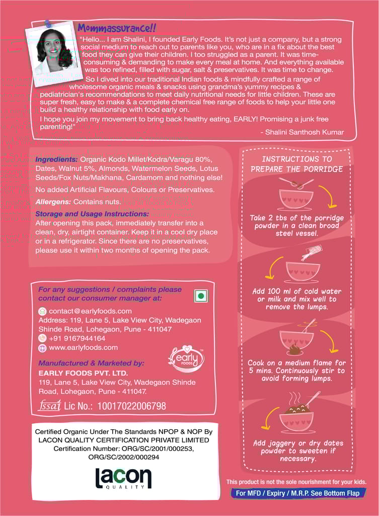 - Ingredients include Organic certified millets (Ragi, Little Millet, Kodo Millet), Almonds, Watermelon Seeds, Dates, Walnuts, Makhana and Cardamom Best for children who have eaten and exposed to all grains and nuts
