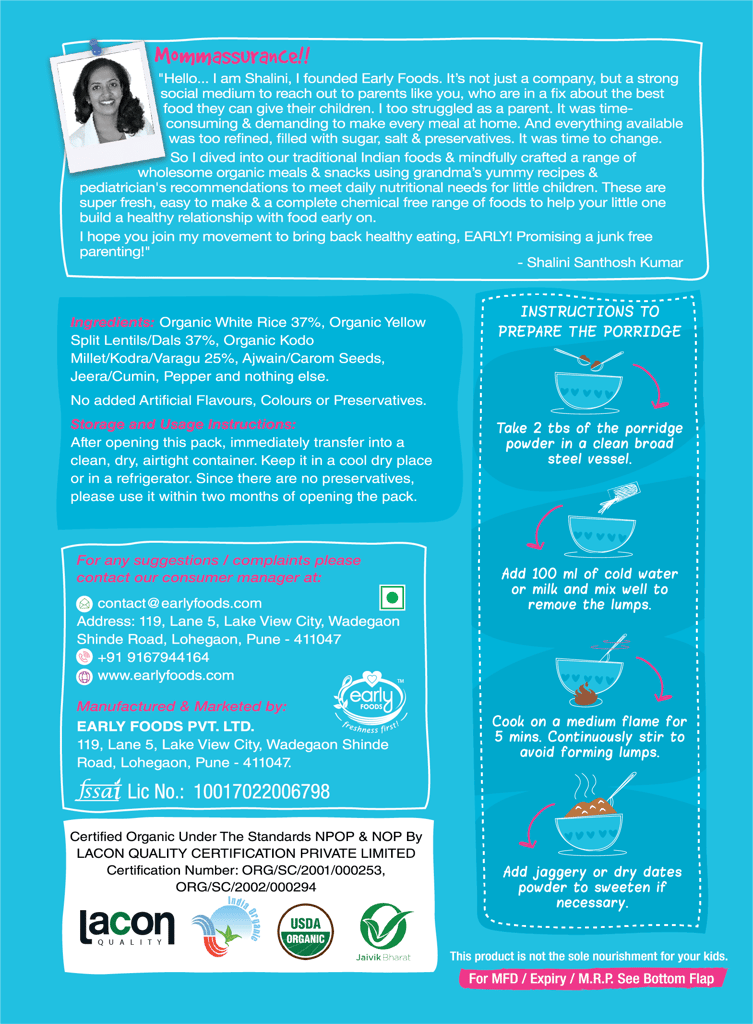 - Freshly prepared variety of certified organic millet porridges for your little ones