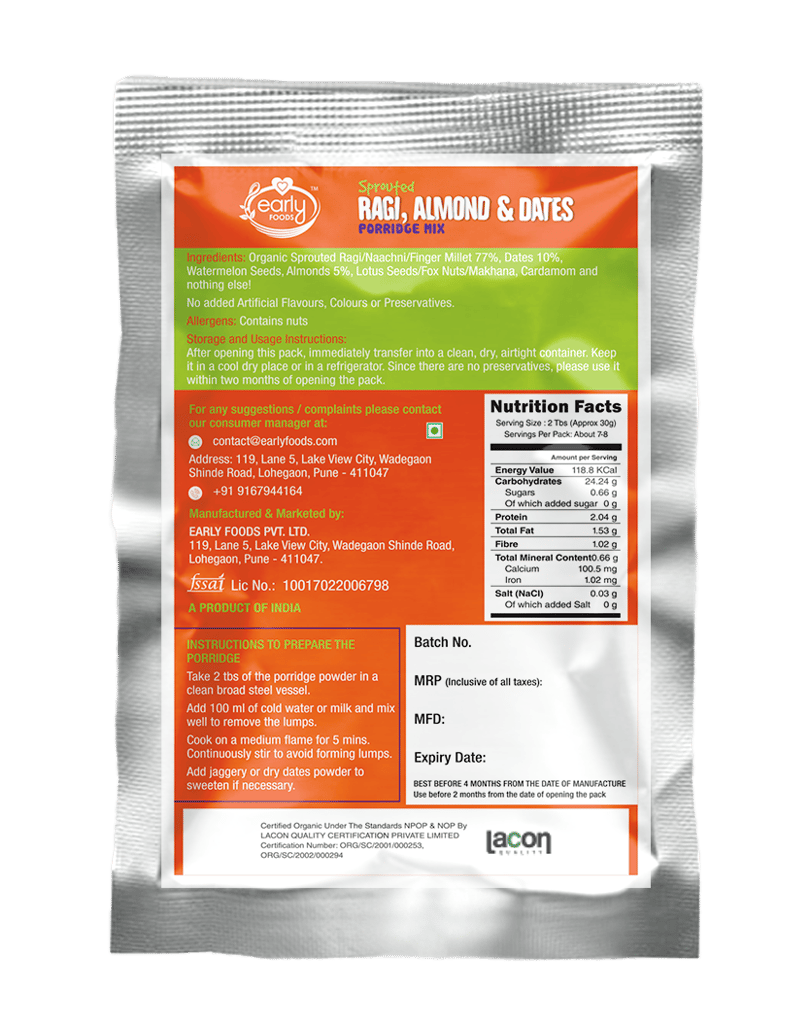 • Ingredients include, organic certified millets, cereals, dry fruits, seeds, cardamom, makhanaIt s a Stage 2 food, best for kids who have eaten all grains and nuts previouslyNo added Sugar, Salt, Milk Powder