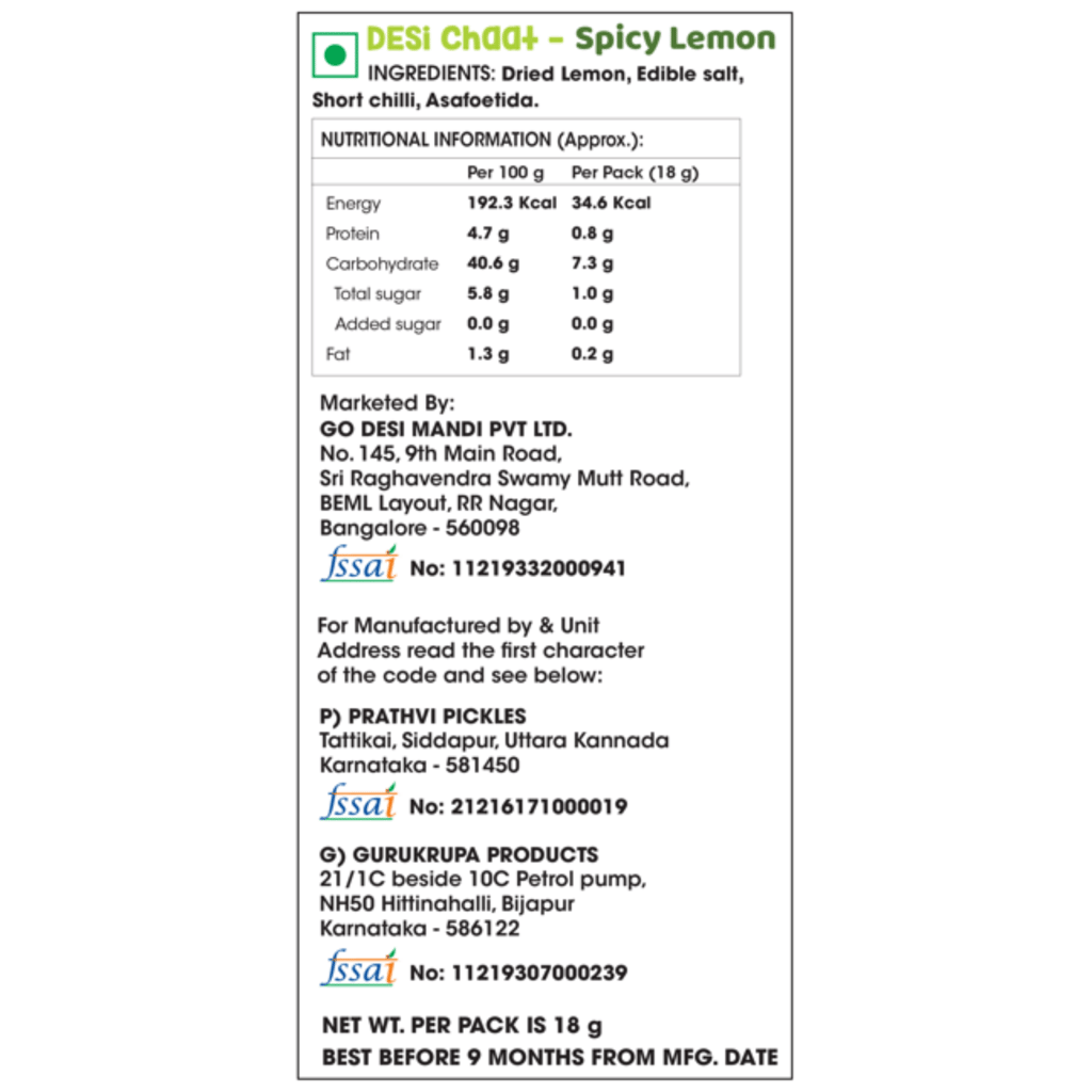 GO DESi Lemon Chaat, Desi chaat, Lemon Candy, 180 gm, Pack of 10 Pouches