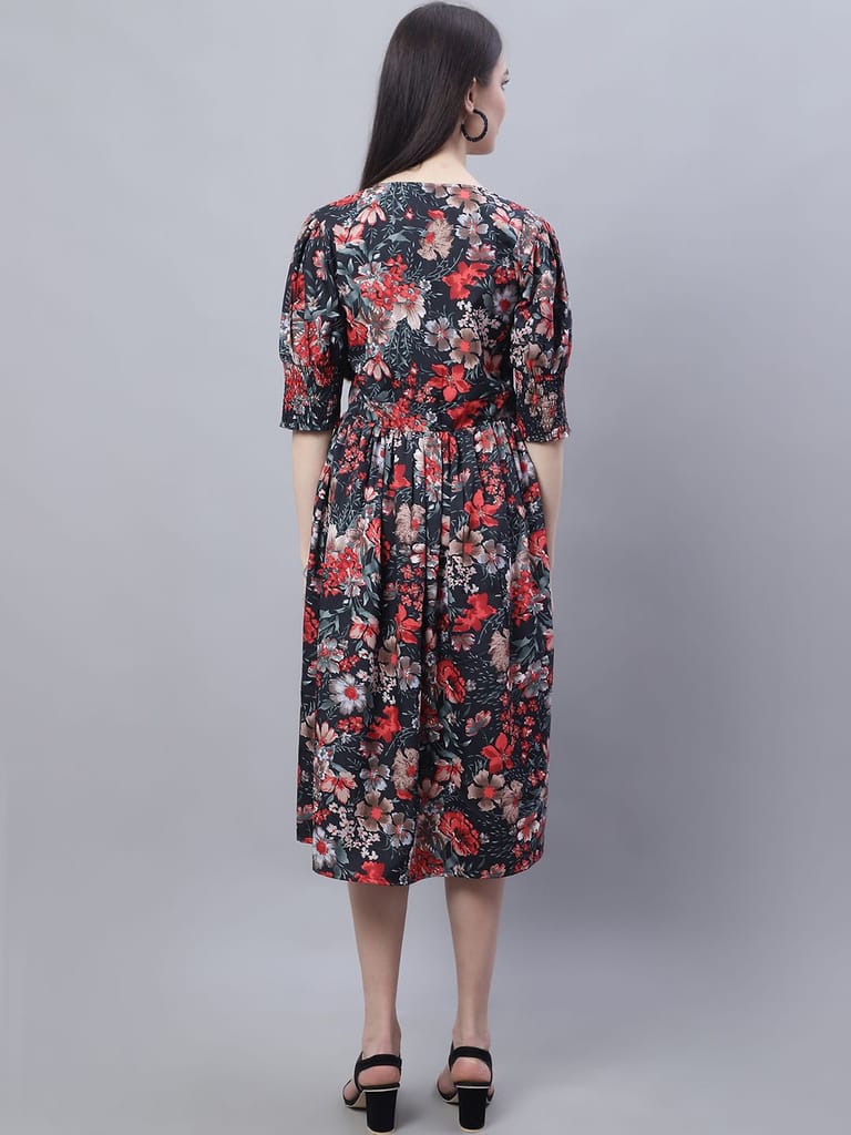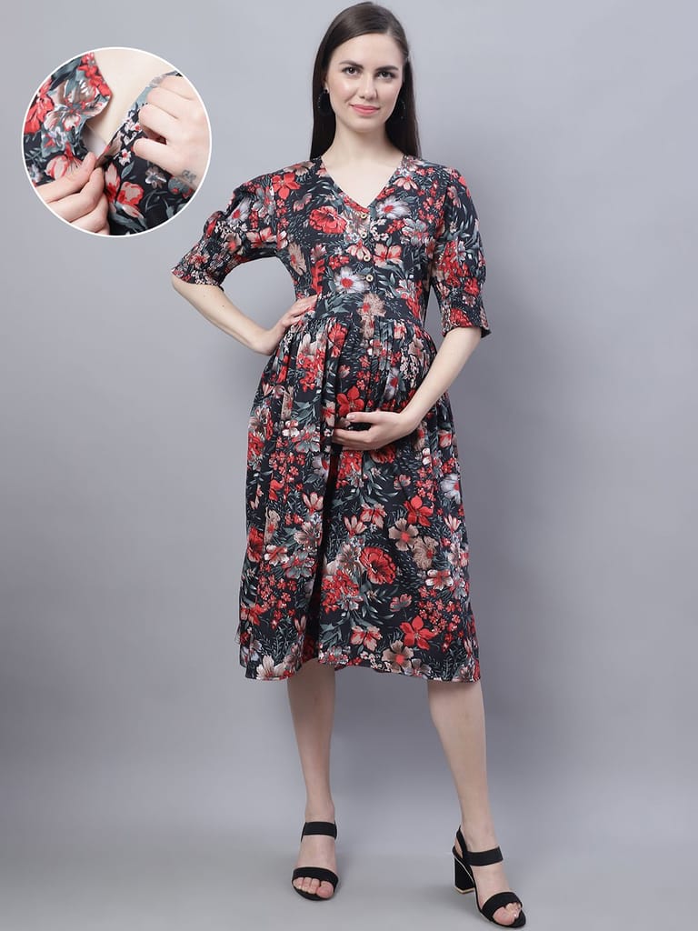 - It comes with elasticated waist, has Round Neck & Half Smoking Sleevess. Floral Print on Black & Red Color Maternity Dress, Front Buttons for nursing post pregnancy.