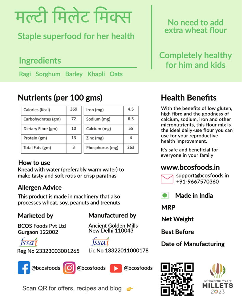- Our multi millet flour is a combination of Ragi, Sorghum, Barley, Oats, Khapli.