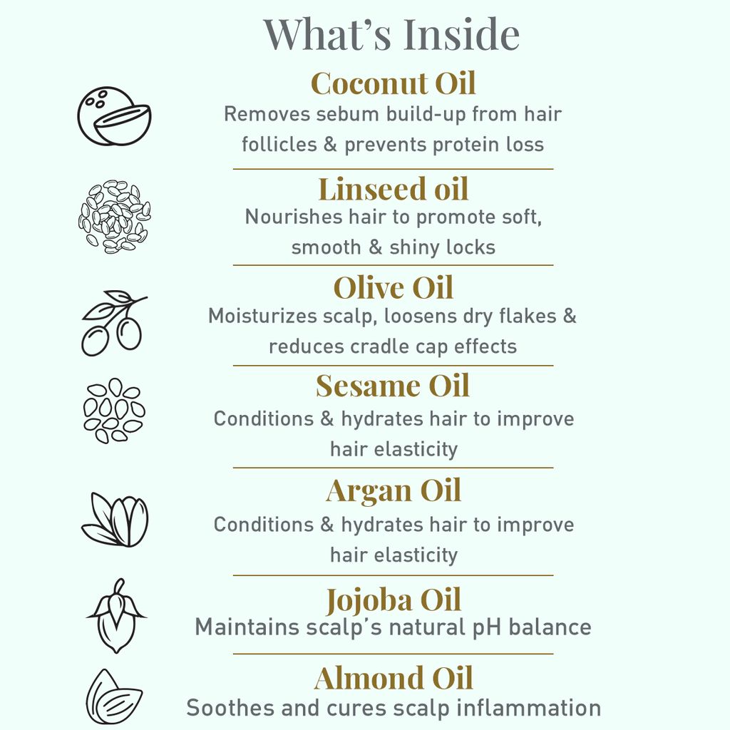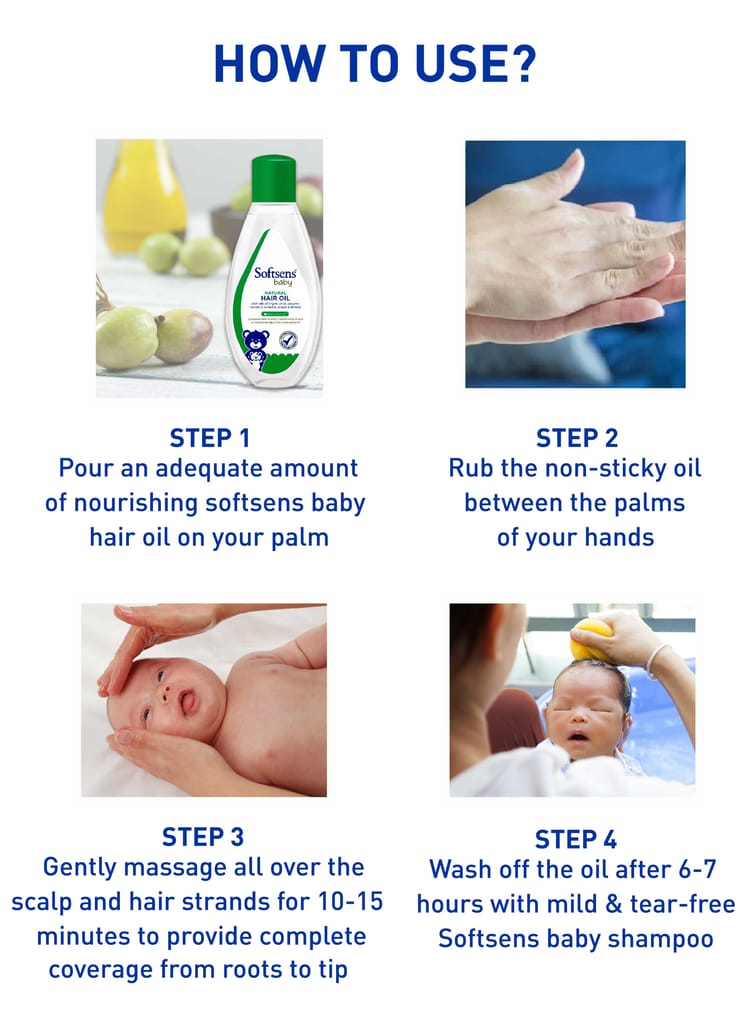 Take a small amount of baby hair oil in the palm of your hand and spread it evenly across baby's scalp, gently massaging it in to help soothe and nourish your baby's delicate skin