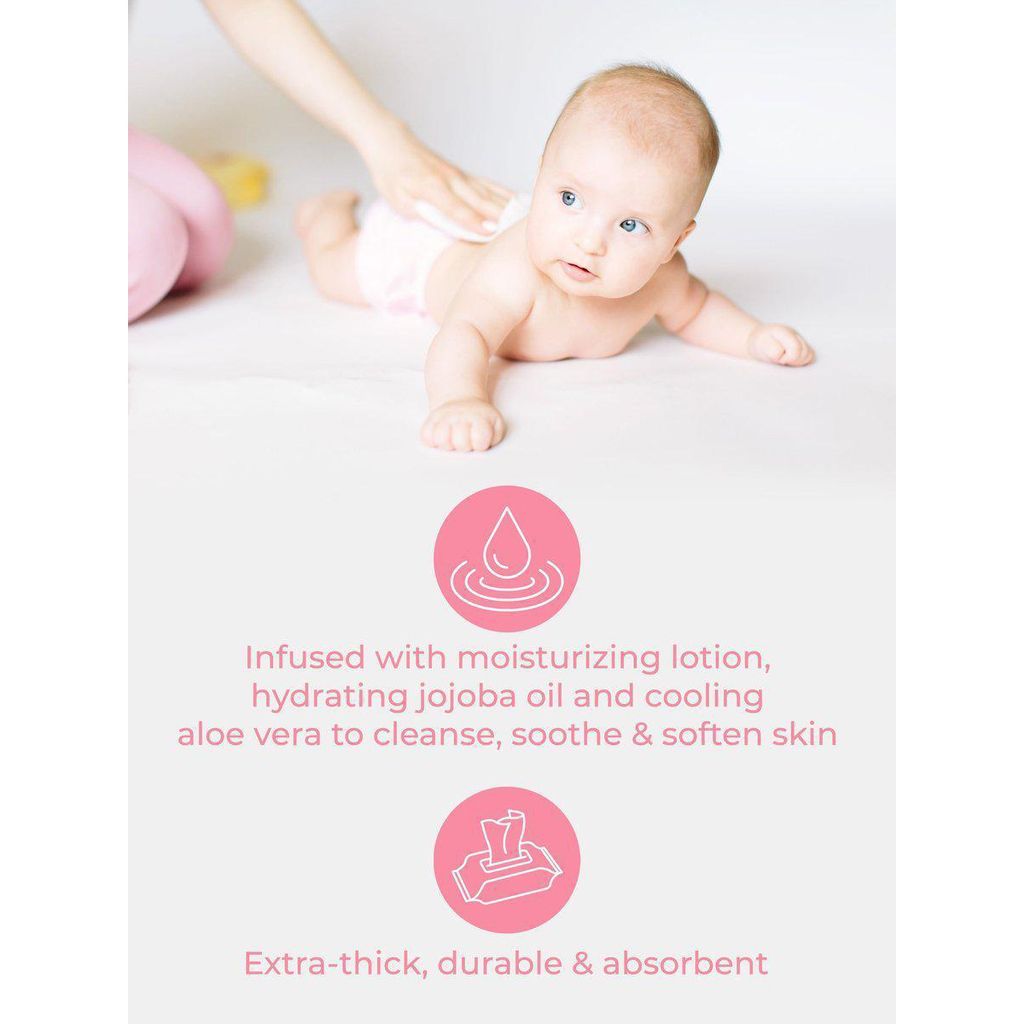 • All-natural cloth baby wipes that are infused with moisturizing lotion, hydrating jojoba oil and cooling aloe vera to cleanse, soothe and soften skin