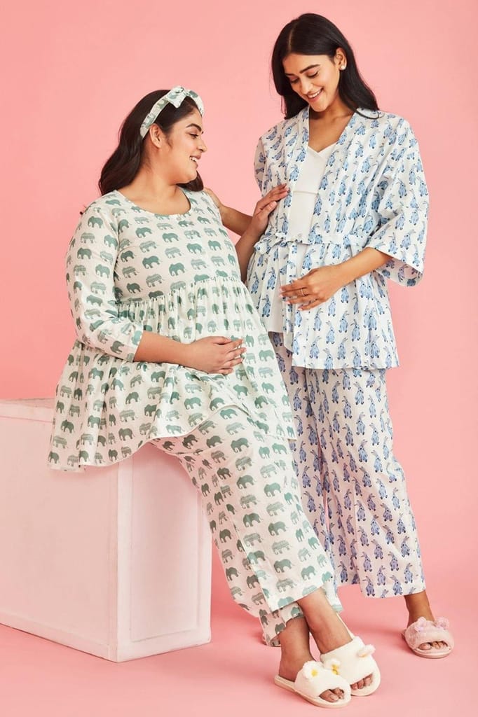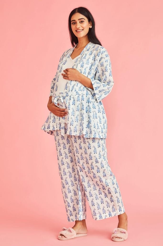 Cool, comfy & super-cute, our _ Cotton Maternity & Nursing night Set is a must-have this season. Our three piece sleepwear gift set includes a nursing top, pants & a robe.
