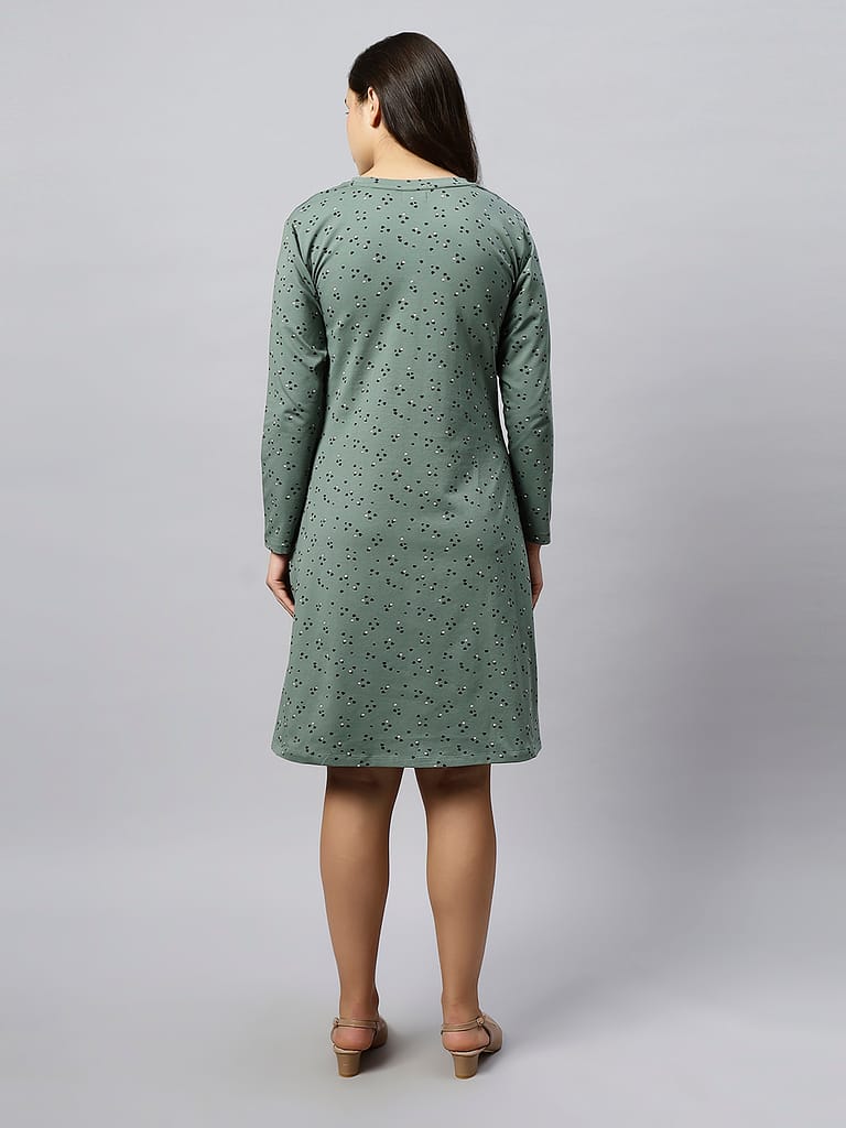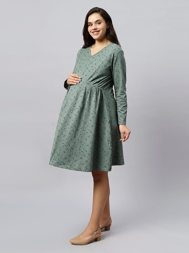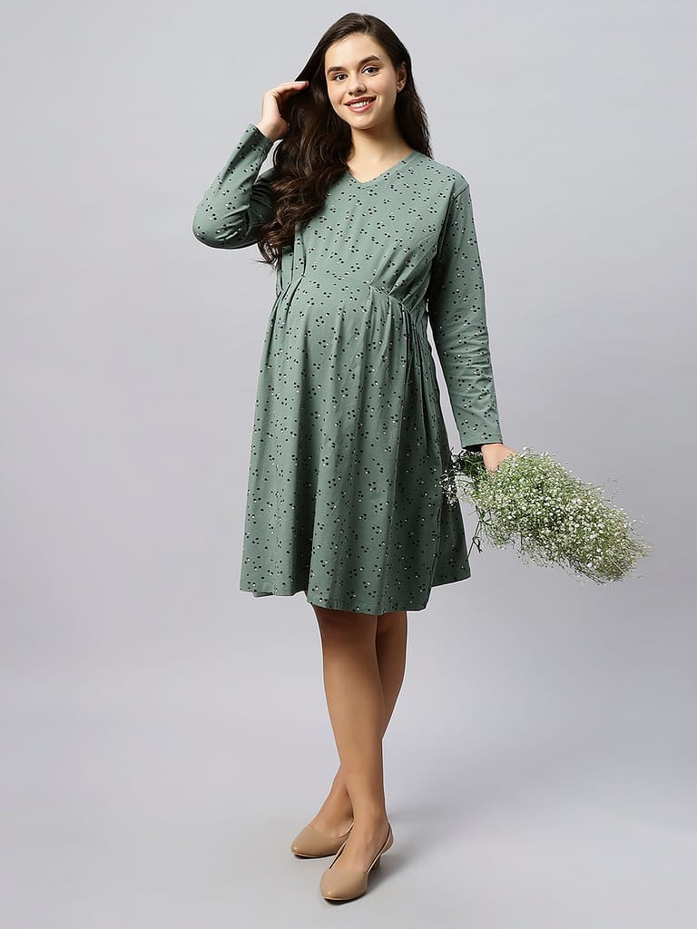 - Falling down the knee, and featuring smart full sleeves; this flared dress grows with you for a flexible fit during and after pregnancy.