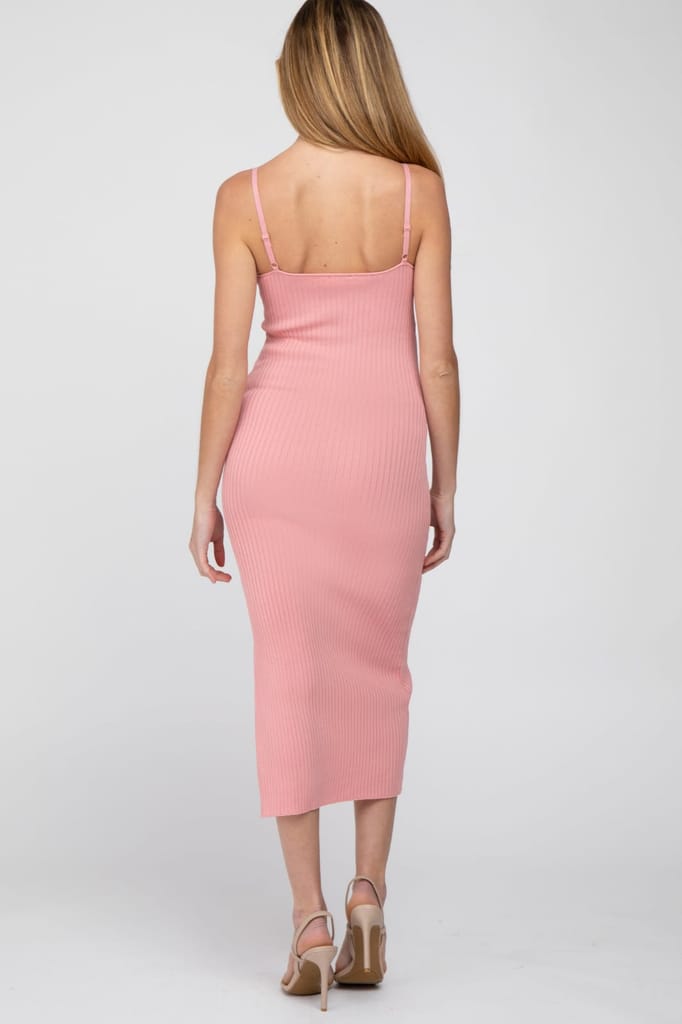 - A ribbed knit maternity midi dress featuring a square neckline, adjustable cami straps and a side slit.